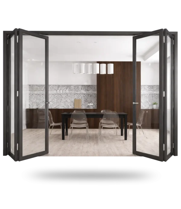 Folding Door – Panorama Glass Type is a modern aluminium folding door designed to create a wide and seamless opening between spaces. Featuring large clear glass panels and a strong aluminium frame, this door allows maximum natural light to enter while maintaining durability and stability.