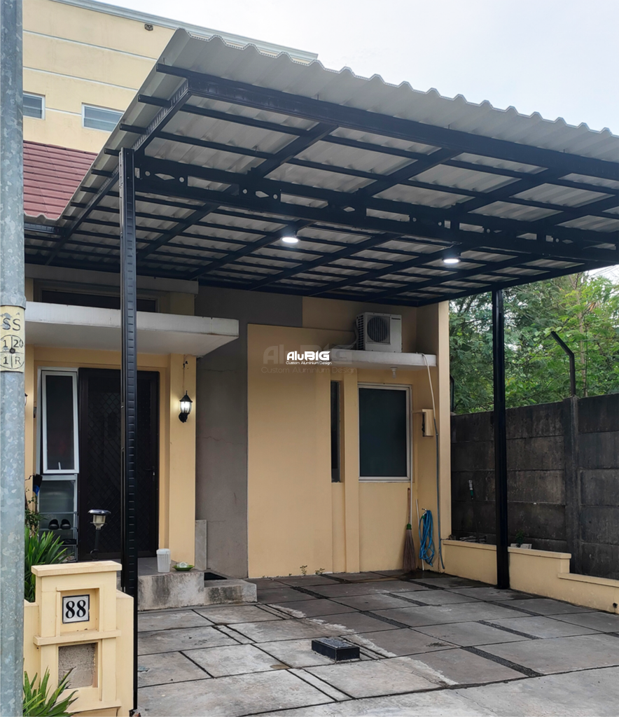 A modern minimalist canopy featuring a strong black steel frame combined with a durable corrugated roof. Designed to provide optimal protection from heat and rain while maintaining a clean, structured look.