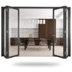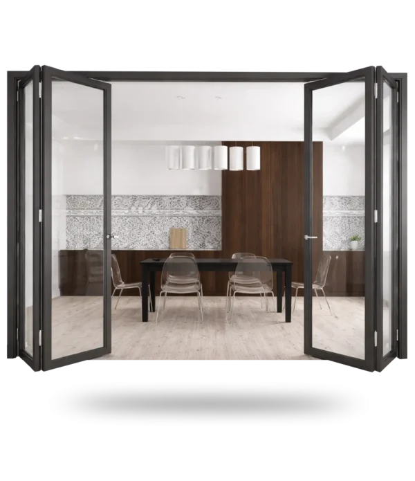 Pintu Lipat – Tipe Kaca Panorama adalah pintu lipat aluminium modern yang dirancang untuk menciptakan bukaan lebar dan tanpa celah antara ruangan.