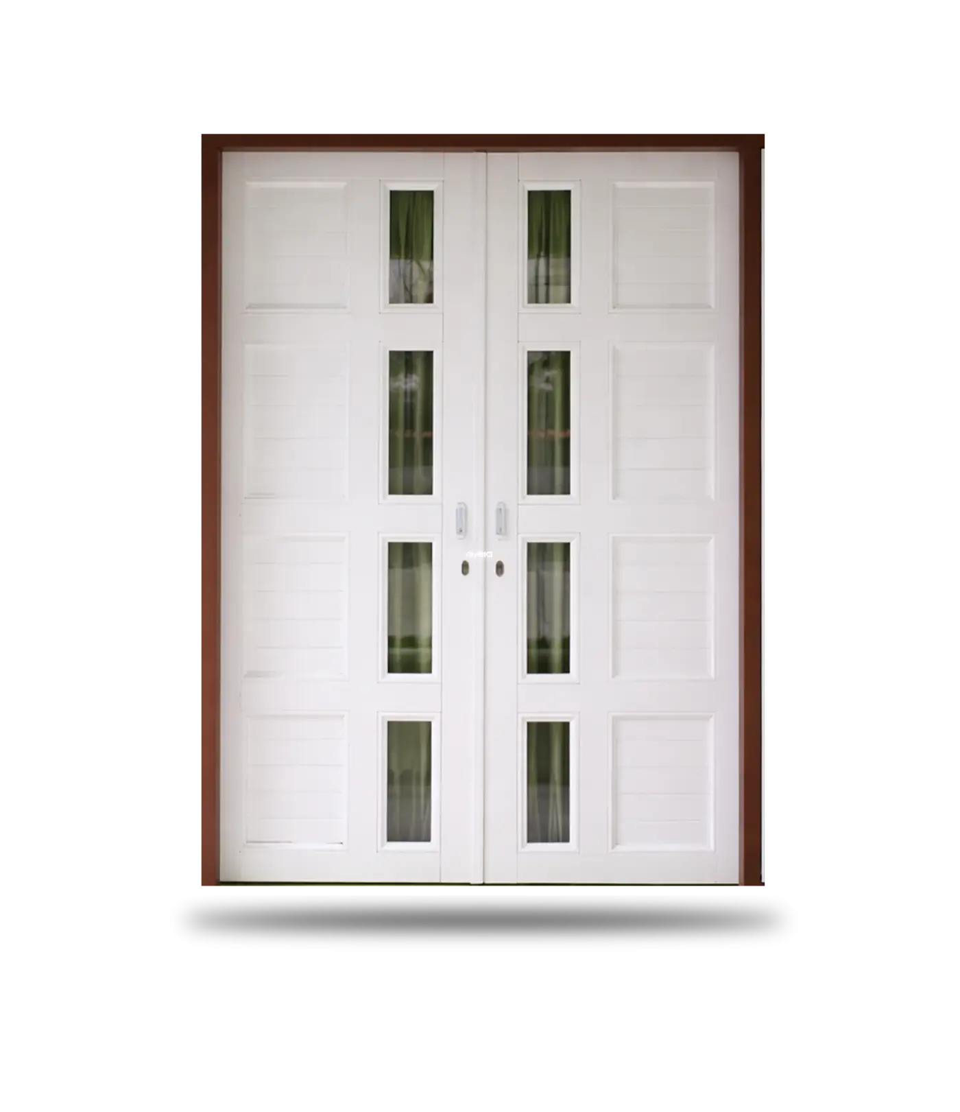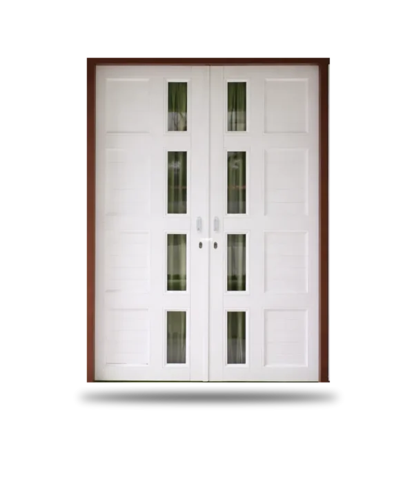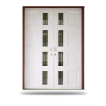 Pintu ganda aluminium putih yang bergaya, dilengkapi dengan panel kaca elegan dan jendela samping besar yang memungkinkan cahaya alami masuk ke dalam ruangan.